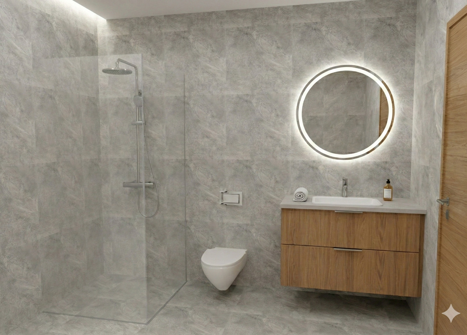 Baðherbergi: Sérsmíðuð innrétting frá TAK. Flísalagt í hólf og gólf.