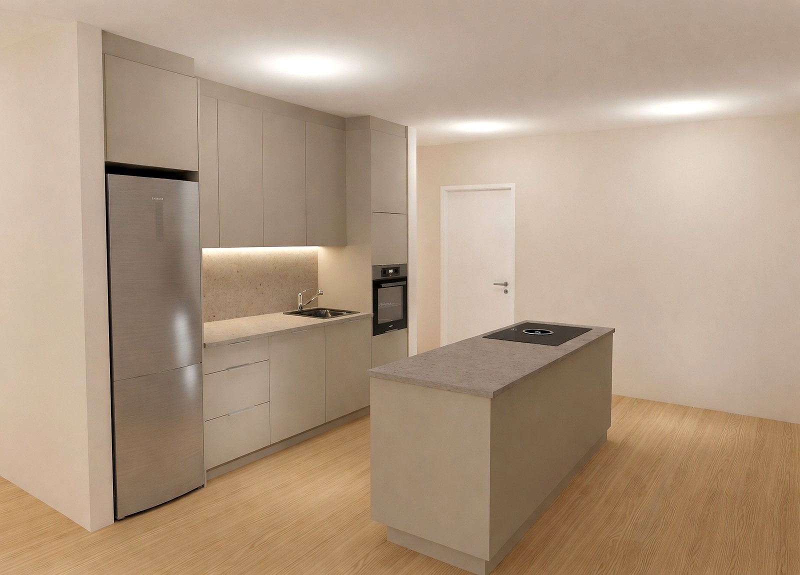 Alrými: Stofa og eldhús mynda samfellda heild þar sem gólfsíðir gluggar tryggja bjartara rými. Útgengt er á svalir um rennihurð.
